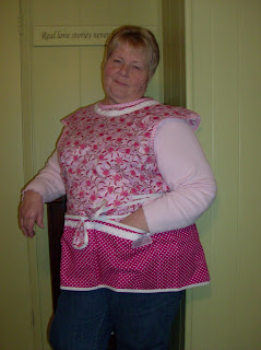When it got here my hubby brought it in to me and he was as excited as I was to get the package open. As we were OOOOOing and AHHHHHHing over the darling tuck-ins, I was wishing I had waited for my daughter and daughter-in-law to come home. My husband enjoyed it so much I was glad that I shared it with him. I laid it all out on my bed so the girls could see it when they got home. Then my Big Dog ( A poodle of course) jumped right on to the bed in the middle of everything. As I was putting it back together the girls came in and it was so much fun all over again. We ate the candy and looked at every thing again. So the picture I wanted to take didn't it get done So here is a picture in my Apron. Thank you again Cynthia E. It was a great day. P.S. I love the gloves and the tissue holder.